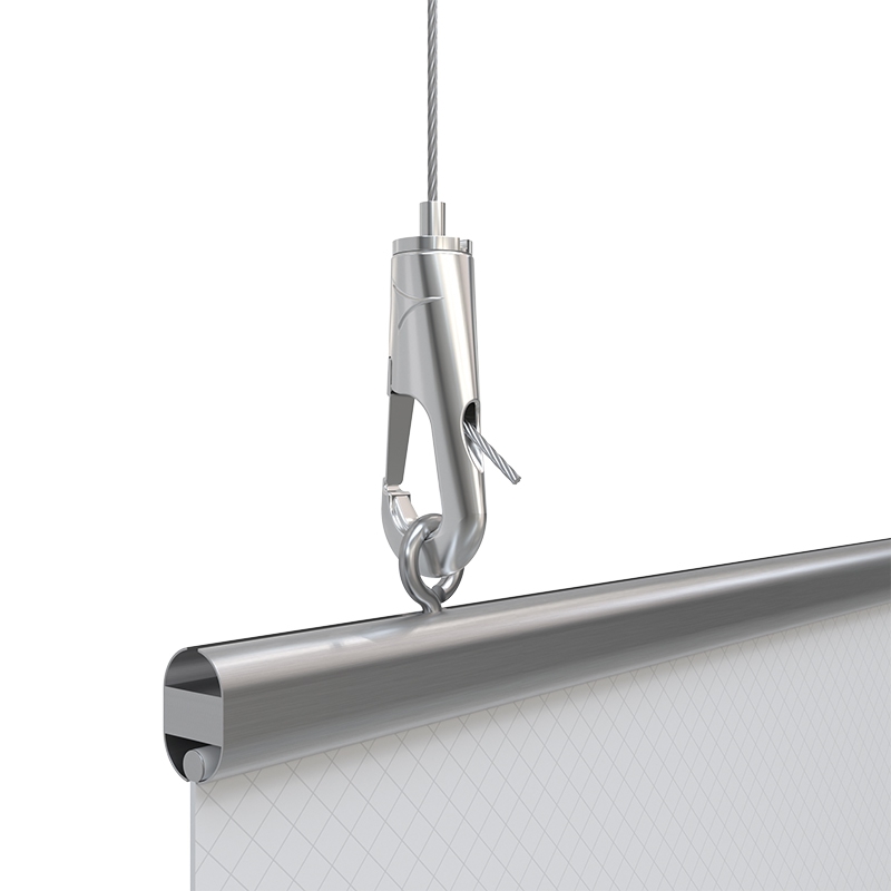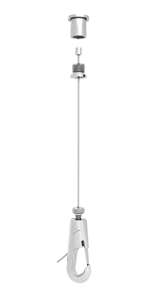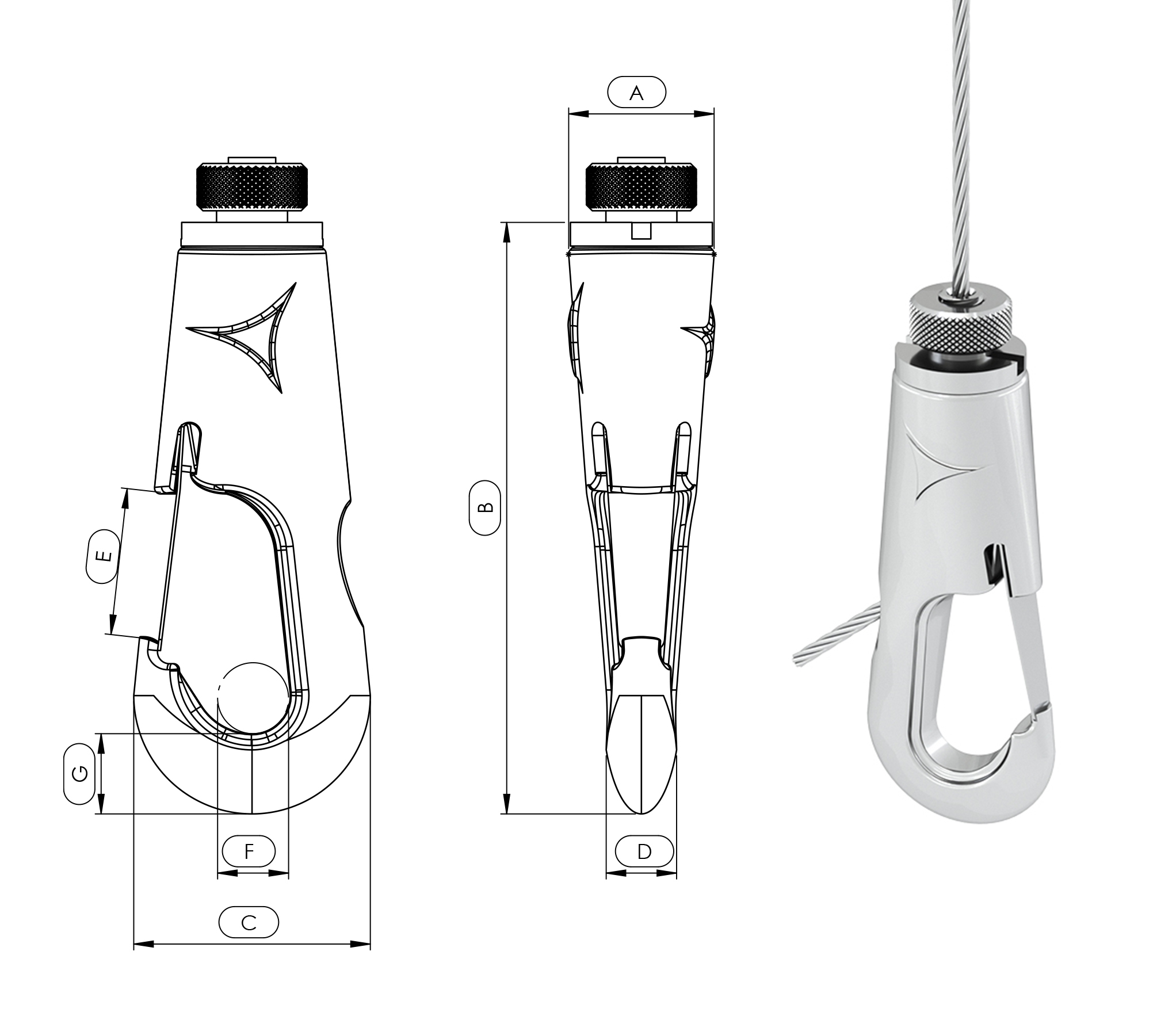 Designhaken WROP Typ 15 V-ZW mit Aushängesicherung und Verriegelungsmutter, seitlicher Seilausgang, silber