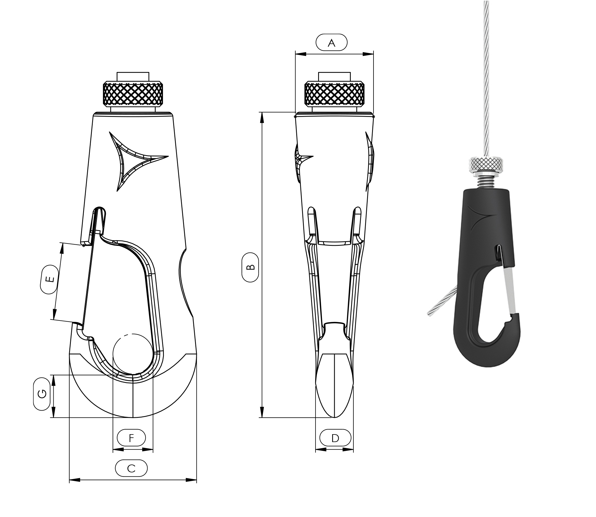 Designhaken WROP Typ 18 V-ZW, mit Aushängesicherung und Verriegelungsmutter, seitlicher Seilausgang, schwarz