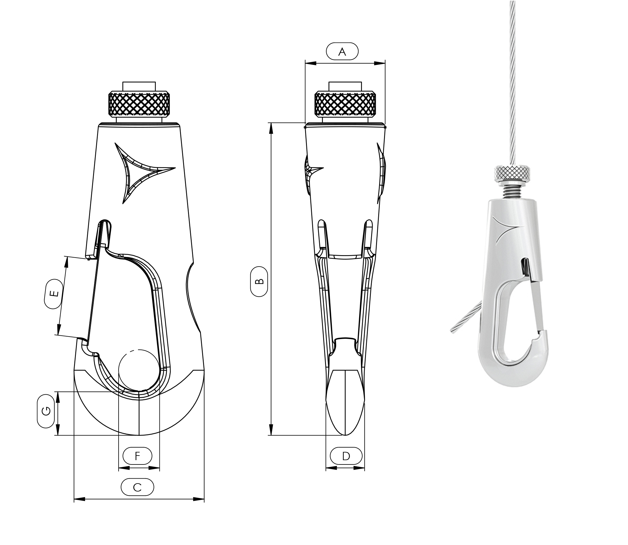 Designhaken WROP Typ 18 V-ZW mit Aushängesicherung und Verriegelungsmutter, seitlicher Seilausgang, silber