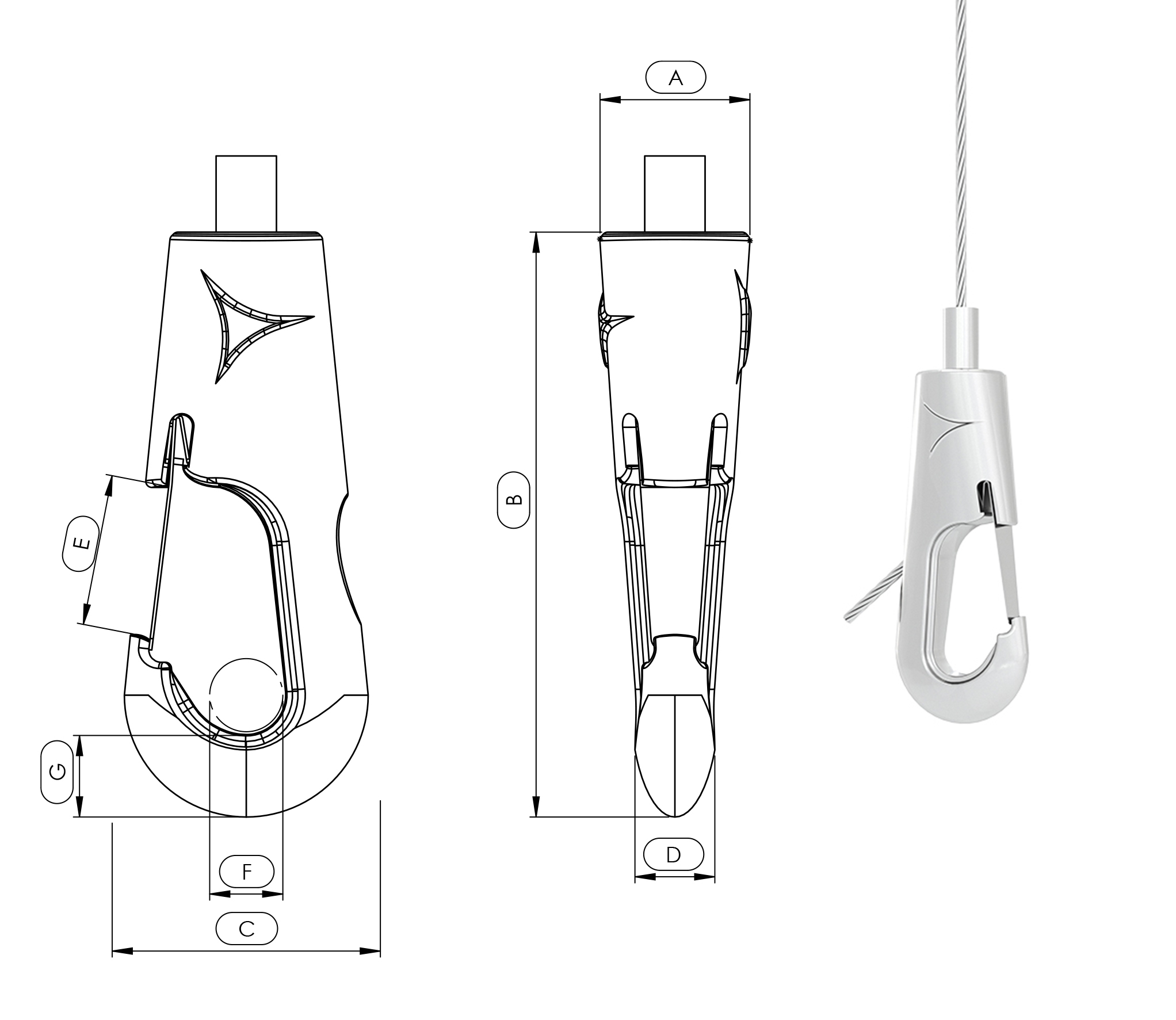 Designhaken WROP Typ 18 ZW mit Aushängesicherung, seitlicher Seilausgang, silber