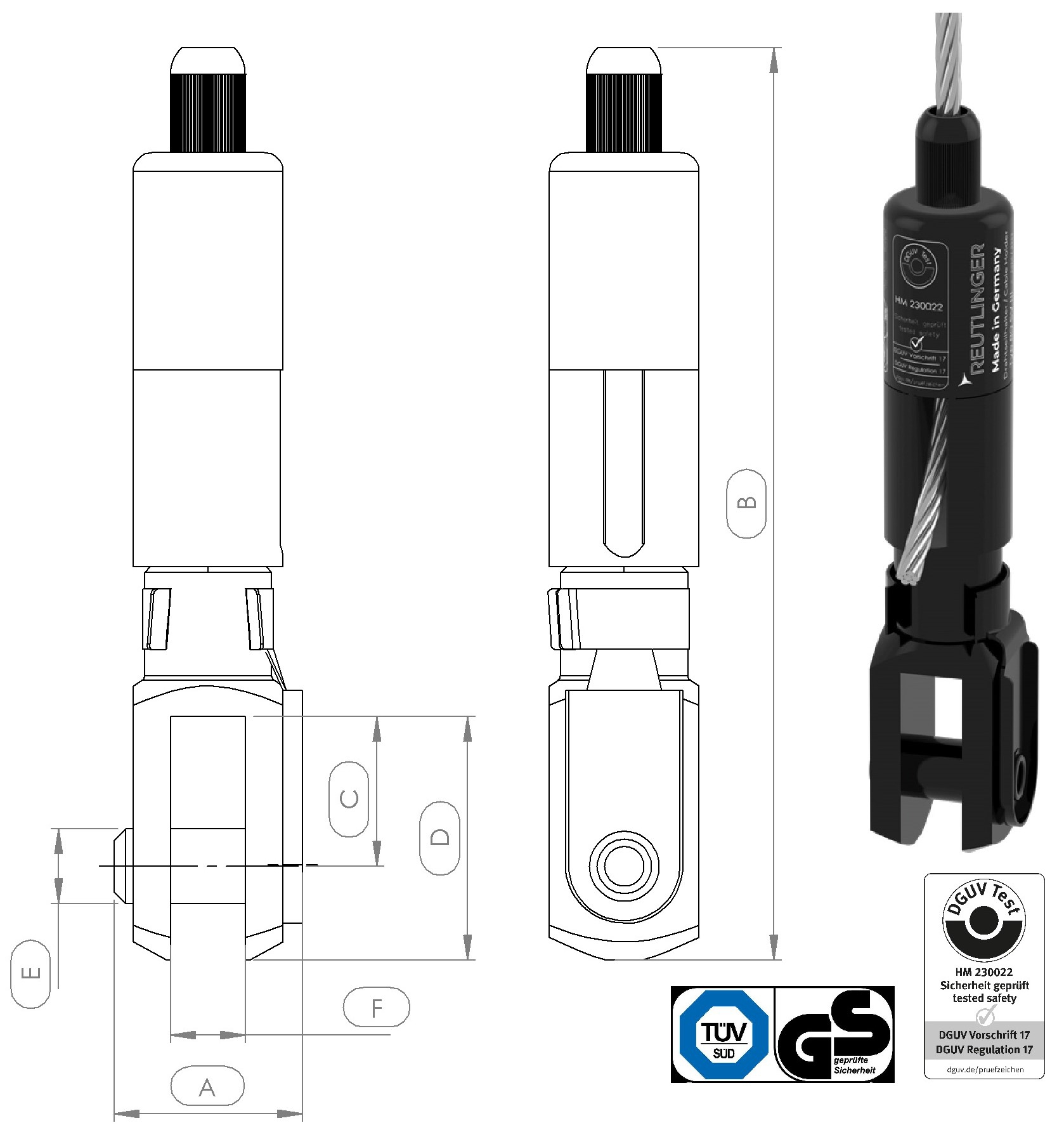 A Bolt length: 50,4 mmB Total length: 243,5 mmC Usable fork length: 40 mmD Fork length: 65 mmE Bolt diameter: 20 mmF Usable fork width: 20 mm