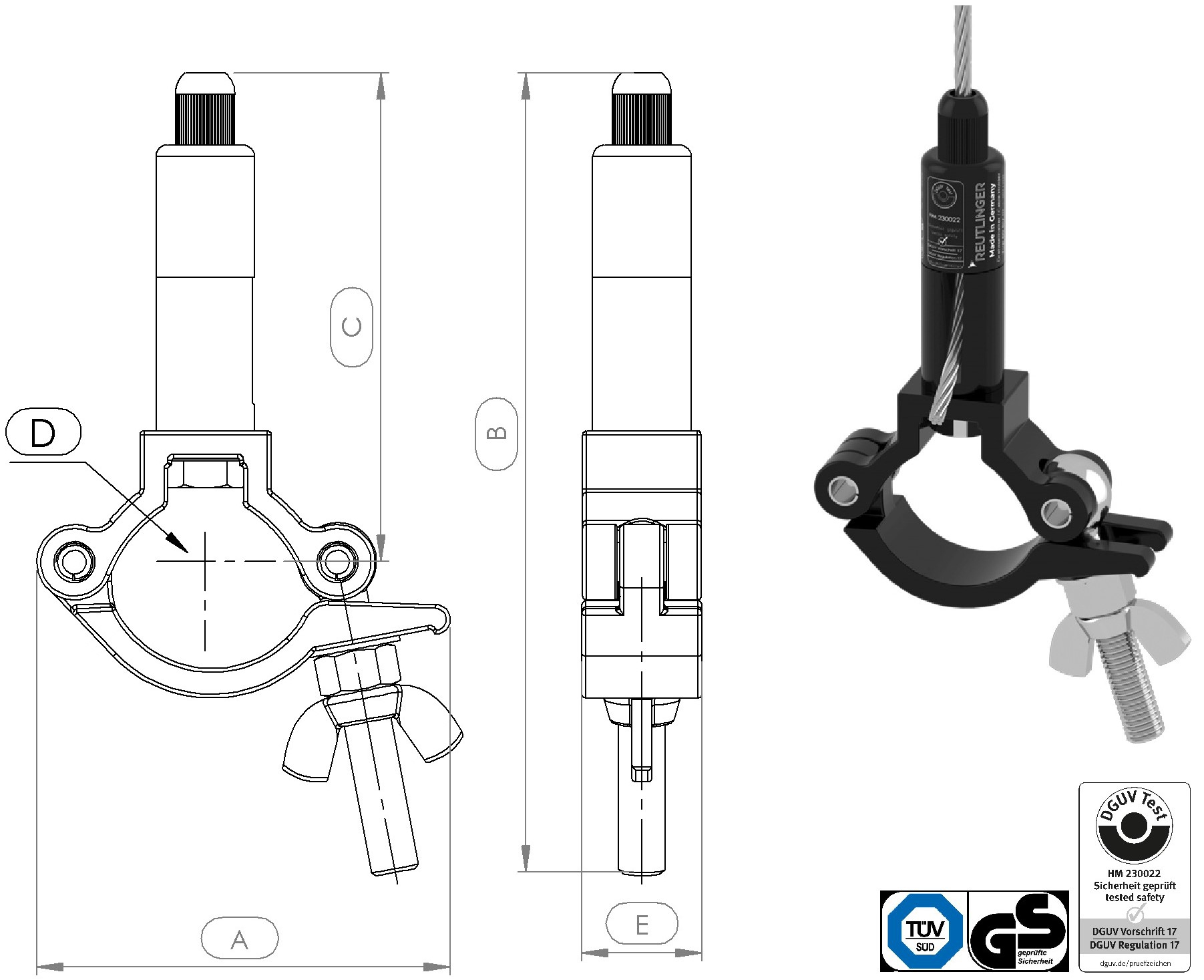 Cable holder type 50 SV III ZW, with Doughty slimline half coupler T58081 with lateral rope exit, black